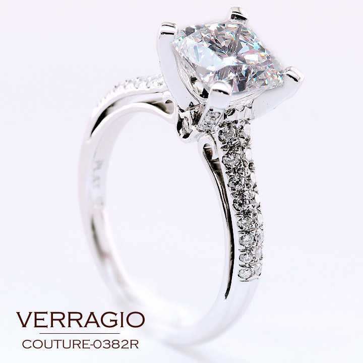 Calling all Cushion Diamond Lovers! Do you Like or ♥ it? Here it is; two and a quarter carat cushion-cut diamond sparkling in the COUTURE-0382R engagement ring which was customized to have additional diamonds on the four prongs in Platinum with 0.30 carat of side diamonds on the band. Enjoy!