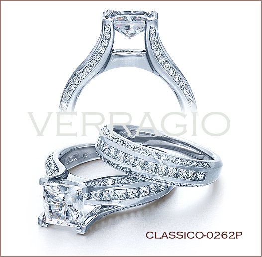 The beauty of the channel set is that the diamonds on the shank flow in a continuous line up the band, but for those who just can’t make up their mind, the Classico 0262P combines the best of both worlds. The Princess cut diamond center, set in Verragio’s exclusive Lumino setting, sits atop four prongs that are pave’ set on one sides and channel set down the middle of the shank. No matter how you set it, that ring has a lot of sparkle.