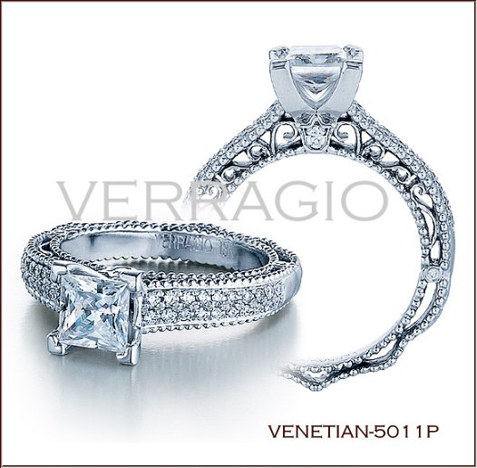 However, if center diamonds are more your style but you still would like a little splash of color, Verragio have been known to substitute accent diamonds for gemstones. The Couture 0410LR, featuring either a Round cut or Princess diamond center, was once specially made with a small sapphire in the signature crest under the band, retaining the white sparkle of a diamond, but still incorporated an eye catching special feature.